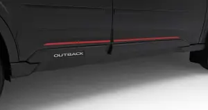 Designed to enhance the rugged exterior appearance of the Outback and Outback Wilderness, Door Cladding is an upward extension of the lower door trim. This accessory withstands a series of tests for fade, scratch and crack resistance, and evaluated to help ensure aerodynamic performance is not impacted.